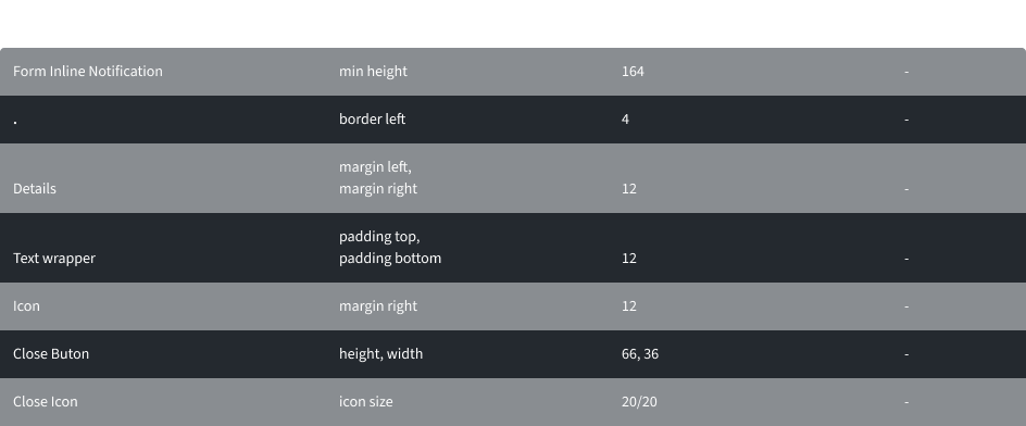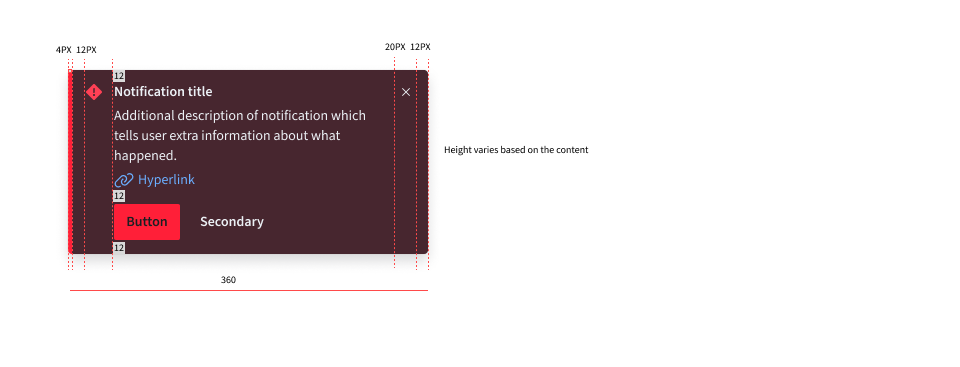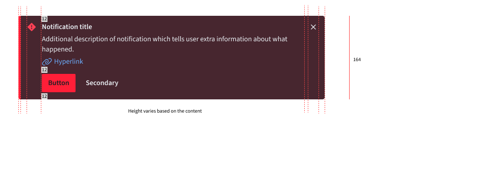 The width of inline notifications varies based on content and layout. They can expand to fill the container or content area they relate to. Their height is based on the content length, which should not exceed two lines of text.