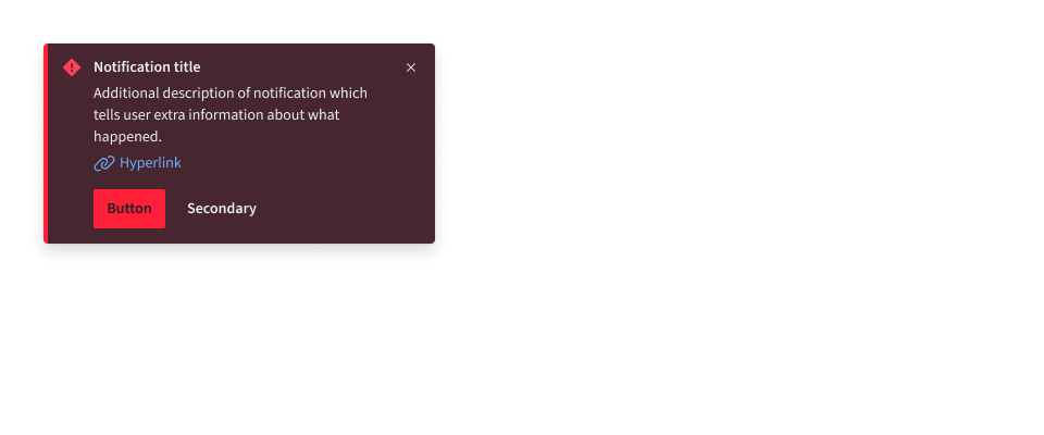 Inline notifications do not dismiss automatically. They persist on the page until the user dismisses them or takes action that resolves the notification. A small “x” in the top right corner is used to dismiss inline notifications. Including the close button is optional and should not be included if a user must read or interact with the notification.