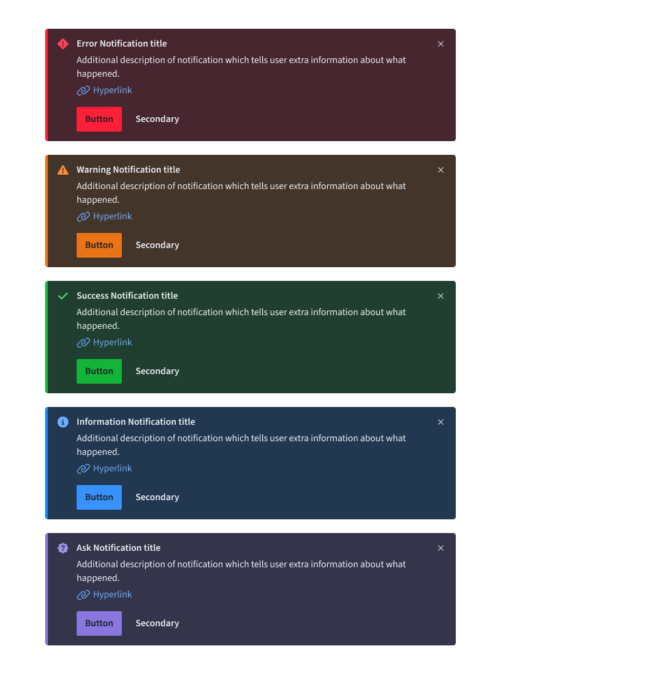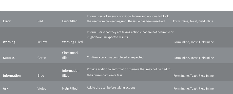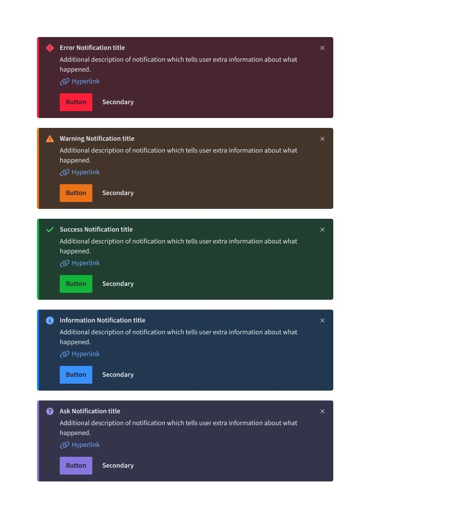 Notification statuses are designed to convey the emotional tone of the information being communicated. Each status is associated with a specific color and icon, ensuring a consistent and universal user experience
